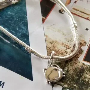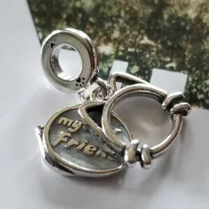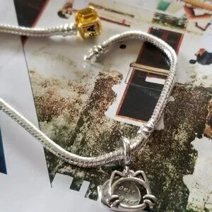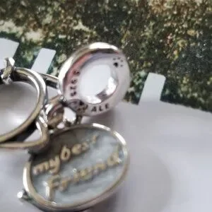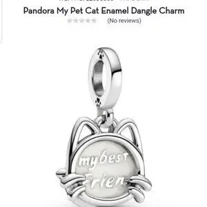 Keep your favorite furry friend close with the My Pet Cat Dangle Charm. Hand-finished in sterling silver with shimmering hand-applied enamel, this cat charm has one disc shaped as a cat's silhouette with whiskers and ears, plus a second disc shaped like a cat's body with a polished tail. A raised message on shimmering enamel on the second disc reads 'My best friend,' while the bail includes two paw stamps on each side. A cat lover's perfect accessory.