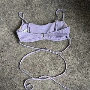 Experience comfort and style with this lavender ribbed bikini top. String ties around stomach. adjustable straps on shoulders and around back. removable padding included