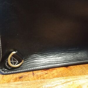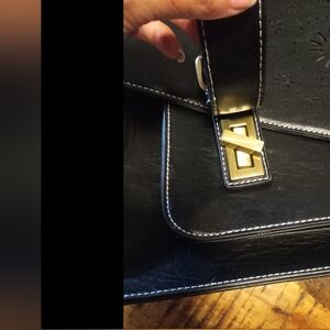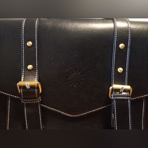 Beautiful unique bag in good preowned condition. Minor signs of use include creasing,bending and minor scuffs. Please review all photos. Includes ONE strap. Zipper closures with turn knobs and buckle accents. Padded inside to protect your electronic device.