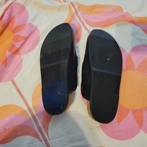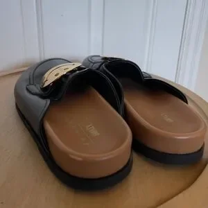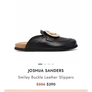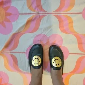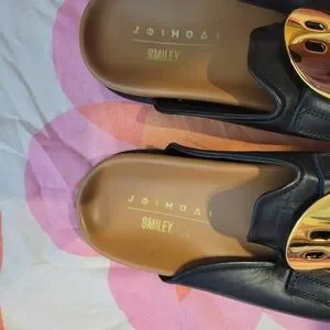 Stylish black mule loafers featuring a gold smiley face design. Perfect for adding a playful touch to any outfit.