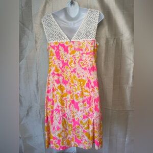 Embrace vibrant style with the Lilly Pulitzer floral dress. Featuring a lively pink and yellow pattern, this dress is perfect for any occasion. Enjoy the comfort and elegance of this standout piece.