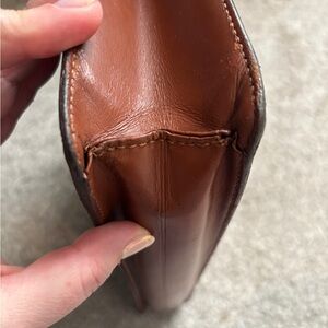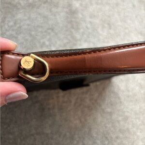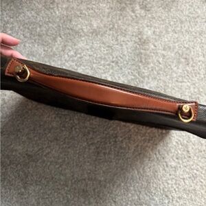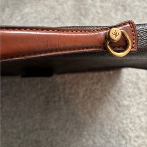 Louis Vuitton Porte Documents Bandoliere Bag in Classic Monogram. This is a vintage bag that shows wear. There is rubbing on the interior and some hairline cracking on the handle. One corner has a separation of the stitches but both corners have been reinforced with leather on the interior. Wear to the bag on the flap at the bend and scratching on the hard ware. No strap.
