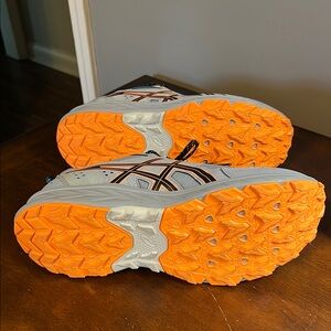 Stylish ASICS running shoes in gray with orange accents. Features black and teal details. Worn once.