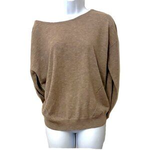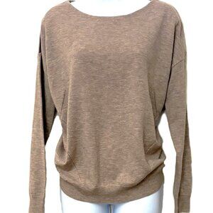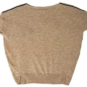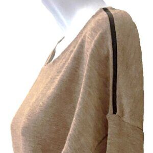 Fine gauge. 95/5 Wool/Cashmere. Wide Scoop Neck. (Can be worn off shoulder). Flattering Wedge Shape. Amazing details: LEATHER black piping at shoulder, Pointelle branding and Pointelle Front Design. Ribbed cuff and Hem. Beautiful Neutral Heather. Lenght 24 Inches from High Point Shoulder. Width 24 Inches Across Chest.