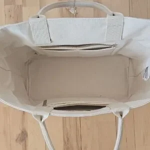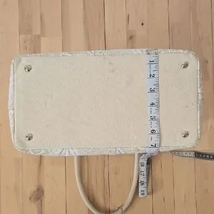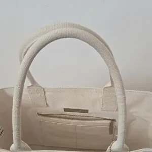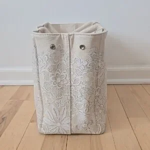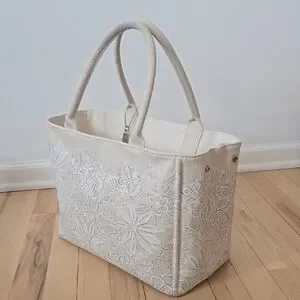 This elegant cream tote bag features a beautiful floral design, perfect for any occasion. Its spacious interior and sturdy handles make it both stylish and practical.