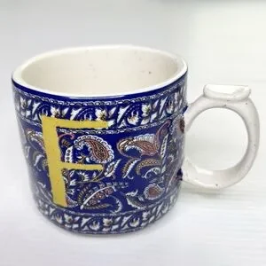 Anthropologie mug with blue & brown paisley design and yellow letter F.