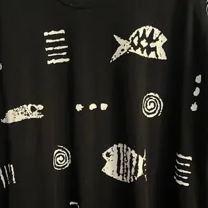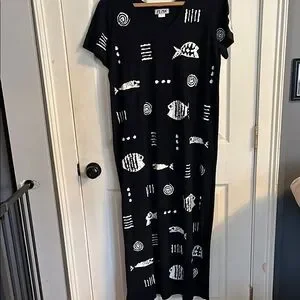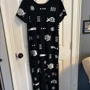Elevate your style with the Black and White Graphic Dress. Featuring a unique fish and swirl pattern, this dress is perfect for any casual outing. Enjoy comfort and style with this standout piece. Dress splits on both sides at the calf for easy walking.