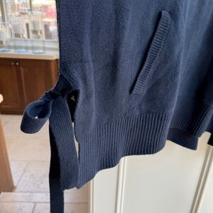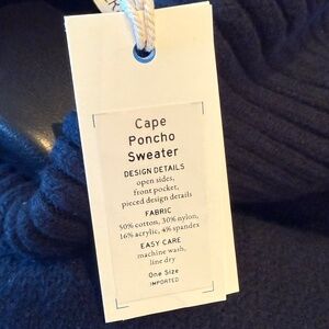 New With Tags! Navy blue poncho/turtleneck sweater with open sides that tie closed. Pockets make it even better. It's VERY cute, soft, AND machine washable. Blend of cotton, nylon, acrylic, spandex. One Size.