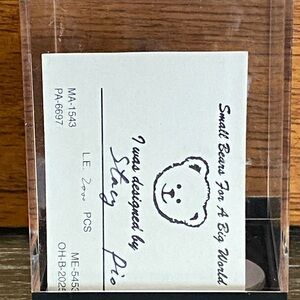 Charming miniature blue mohair teddy bear with a blue ribbon. His name is Malcolm. Artist is Stacy Pio for World of Miniature Bears. Limited edition of 2,000. Sits on a wooden white heart stand. Comes in an acrylic case.