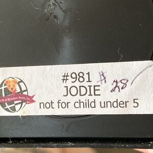 Charming handcrafted mohair teddy bear in brown & white with a green ribbon and floral rose detail on ends of ribbon. Her name is Jodie. Artist is Theresa Yang for World of Miniature Bears. Limited edition of 2,000. Sits on a wooden pink heart stand. Comes in an acrylic case. .