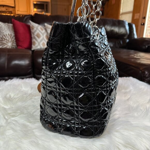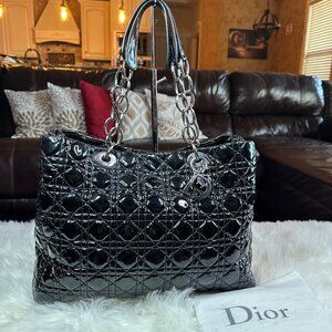 Authentic Christian Dior Cannage Soft Patent Leather Lady Dior Shopper Tote Bag