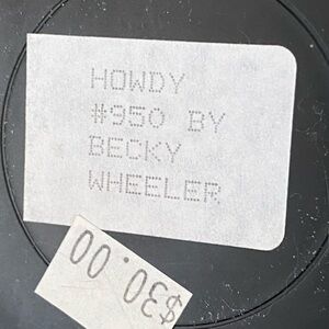 Adorable mohair cowboy teddy with horsey. His name is Howdy. By Becky Wheeler for World of Miniature bears. Collectible limited edition of 2000. Comes in an acrylic case. Comes with a metal stand. Black cowboy hat and red bandanna. Cow print vest. Horsey on a red wooden stick.