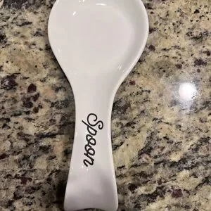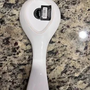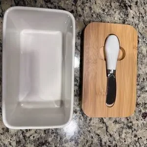 Elegant white butter dish set. Includes a spoon and spreader. Perfect for kitchen decor. New in box.
