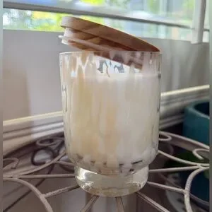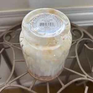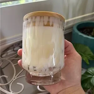 Made of sturdy glass with stylish white/tan/cream dot pattern designs and a cute cork lid. Once candle is all burned you can reuse the beautiful glass jar for a fun storage jar for makeup brushes, pens, etc! โป๏ธ ๐ซ