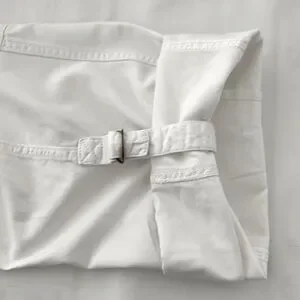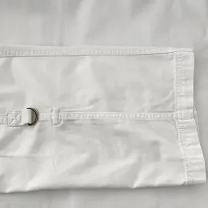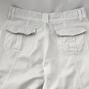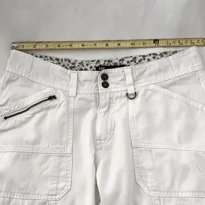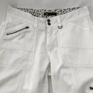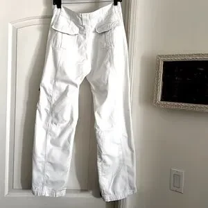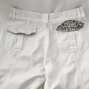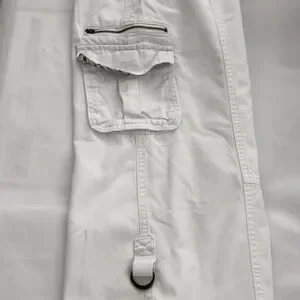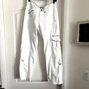 Pockets & More Pockets / White, 2~ button and zipper (with pull tab) front, belt loops, contrasting fabric waistband on inside, 2~ pockets in the 1~with zipper, 2~pockets on side of leg with one with zipper the other with contrasting flap button closure, 2~back pockets with contrasting flap button closure, length on legs can be shortened with strap. No size tab view the measurements,