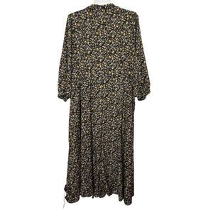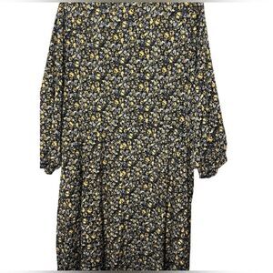 Dark blue and yellow ditsy floral midi dress ,3/4 sleeves , pockets , buttons down the front