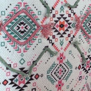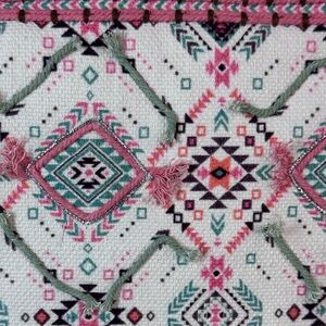 ๐ 100% Cotton, Canvas & Leather; embroidered delicate patterns in hues of pink, accented with mint fringe