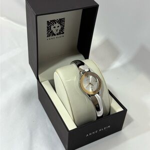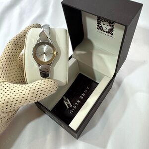 Elegant Anne Klein watch with a silver finish. Comes in a stylish box. Extra link inside and watch care. Water resistant, stainless steel back. Plastic still on face, never worn. Needs battery.