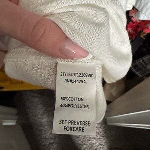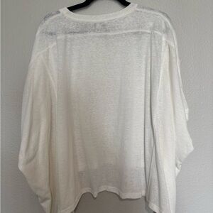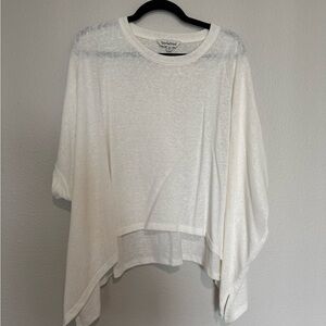 White top with kimono-style sleeves. Longer on sides for flattering fit. In like new condition, never worn. Fits true to size. Purchased from VICI. Slightly sheer fabric, works fine with a nude bra.