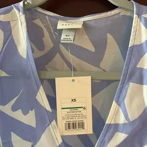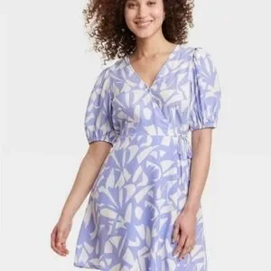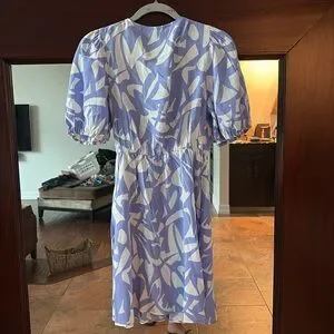 This is a gorgeous brand new with tags periwinkle, and white dress. It’s got a gorgeous puff sleeve side tie Snap in the front.