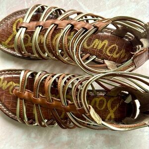 Sam Edelman Kamille Gladiator Strappy Gold and Tan Sandals Sz 8 Women's. Leather gladiator straps that cover just above the ankle. Back zip access. Open thong toe. Perfect for the beach, cruise, festivals, and more. Have the pedi ready!