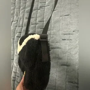 Elevate your style with the Nike Black and Cream Faux Fur Shoulder Bag. This chic accessory features a plush faux fur design with a striking cream swoosh logo. Perfect for adding a touch of luxury to any outfit.