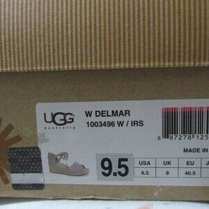 For your consideration, I have a beautiful pair of woman's wedge open toe, open heel shoe with fabric ankle strap. Color is lilac/lavender. Authentic UGG product in original box. USA Size 9.5; UK Size 8; EU Size 40.5; Japan Size 26.5 ; 2" heel. Very comfortable/very minimal wear. Very good condition. Upper: Textile Lining: Leather Outsole: Rubber