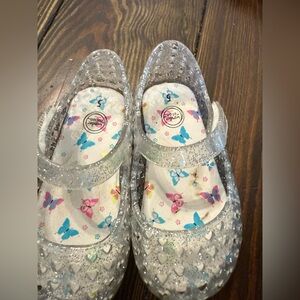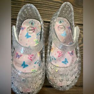 This listing is for two pairs of wonder nation jelly sandals size 5 and 6. The size 6 were washed with something of color so the insoles absorbed the color but not the rest of the shoe. Shoes will be cleaned and wiped down thoroughly upon purchase. In good condition. Perfect for summer and cute little dresses