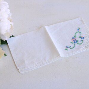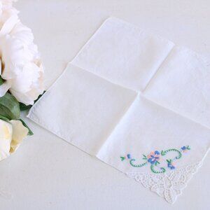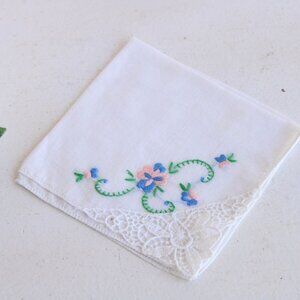 Gorgeous vintage handkerchief in white with pretty lace in one corners and floral embroidery in blue and pink. Cotton or a cotton linen blend. Measures about 10" square. Probably 1940s or 1950s or so.