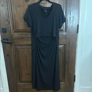 This MLM maxi dress in a classic black color features a chic v-neckline and short sleeves, ideal for casual occasions. The ruched detail on the side enhances its silhouette, offering a stylish yet comfortable fit for everyday wear. nursing dress!!