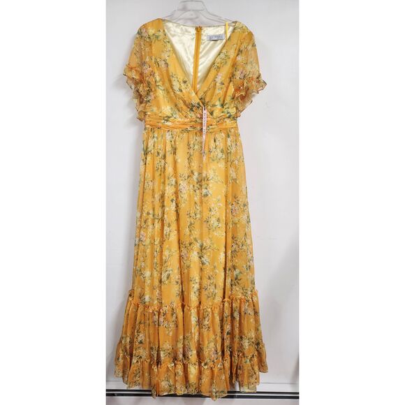 Whimsical floral maxi dress with a ruched bodice and faux-wrap v-neckline, sheer flutter sleeves, pleated waistband, and a tiered flowy skirt.ÂÂ