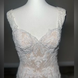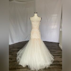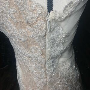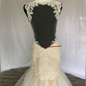 ~~~This is a sample floor dress. It has quite a few imperfections from handling dress. One small tear in the back of the illusion dress. One long tear in the train and the rest are loose strings in the bodice of the dress. Please see pictures for reference. ~~~