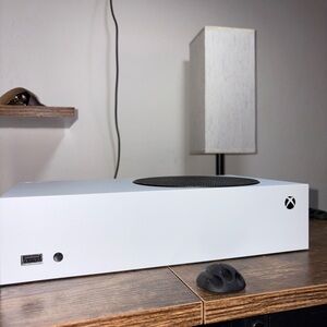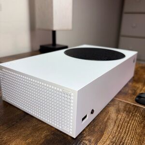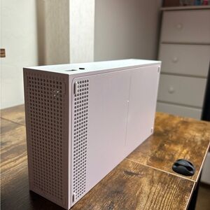 Sleek white gaming console featuring a black vent. Modern design for gaming enthusiasts. Treated me very well, no scuffs or exterior damage whatsoever. This console is in great shape and ready to be put back to use.