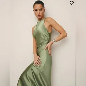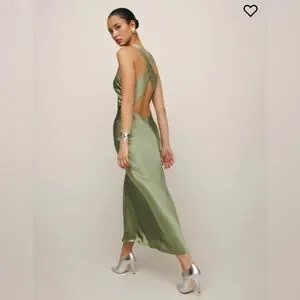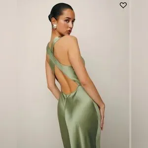 Designed to be fitted throughout. This elegant green satin dress features a stunning open back design, perfect for any special occasion. The luxurious fabric and sophisticated style make it a must-have addition to your wardrobe.
