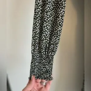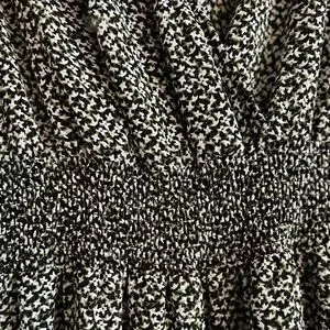 Dress color is black, white with hints of green.