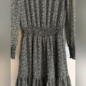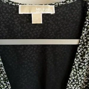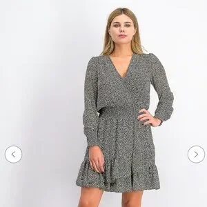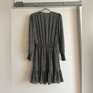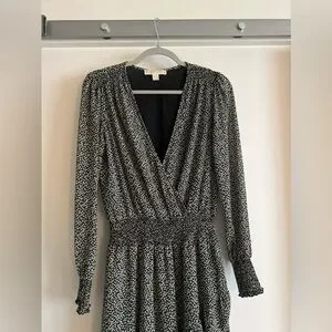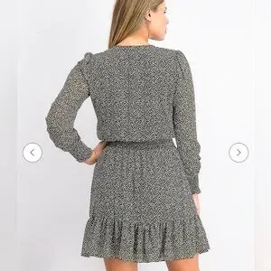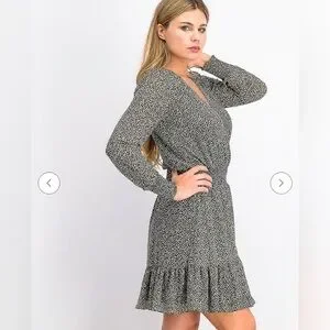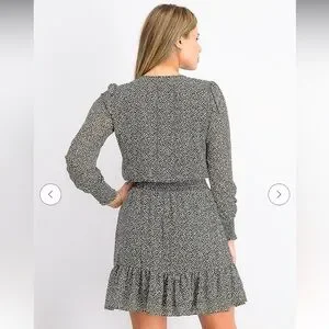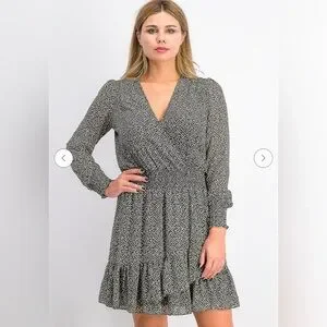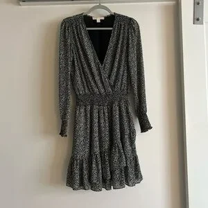 Classic sophistication is yours in this dress from Michael Kors, blending a tiny floral print with a delicate ruffle hem and faux-wrap look.