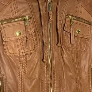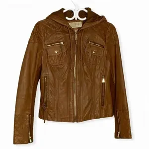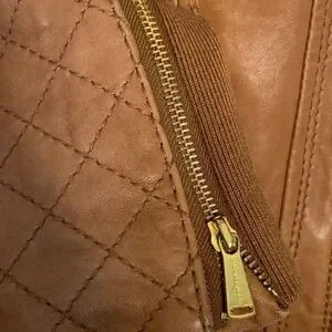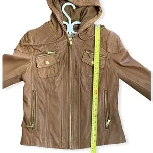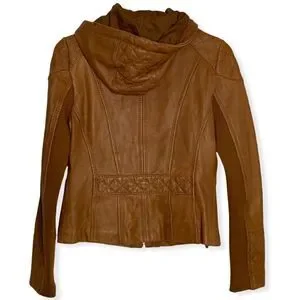 The leather is so buttery soft on this jacket. In very good condition. Colour is a soft caramel shade. Jersey lined foe warmth. Hooded. Unique quilting details. Small mark on shoulder and one stitch pulled. Not noticeable when worn. See photos for condition and measurements to ensure proper fit.