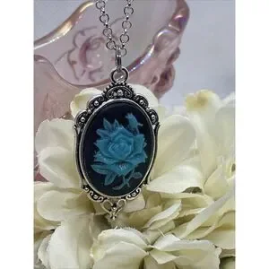 This is a handmade silver-plated necklace featuring a turquoise oval resin cameo with a rose design. The pendant has a vintage-inspired charm style, perfect for occasions like weddings, anniversaries, birthdays, Valentine's Day, and Mother's Day. The necklace comes with a 24-inch rolo chain and has a lobster closure. Ideal for those who appreciate gothic or black-themed jewelry, the piece exudes a unique and elegant flair, making it a standout accessory for Easter celebrations or everyday wear.
