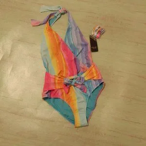 RACHEL Rachel Roy Wrap Front Swimsuit Small NWT. Rachel Roy Wrap Front Belted, Multi- Colored One Piece Swimsuit compliments any frame. 82% Nylon, 18% Spandex. Pull On closure. Hand Wash Only. Removable cups. Classic coverage. Measurements: Bust - 34", Waist - 26, Hip - 36. All items in our closet are sold "AS IS" and described to the best of our ability. Please feel free to send a message if you have additional questions on any item in our closet before purchasing.