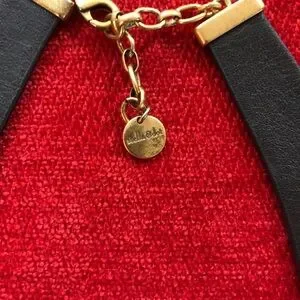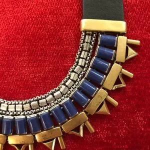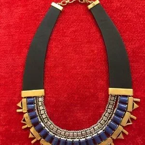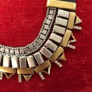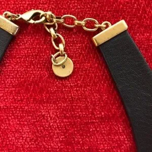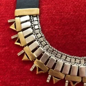 This stunning Stella & Dot reversible necklace features a bold black leather base adorned with gold and silver toned metal elements and sparkling crystal embellishments. The fan-like arrangement of the metal pieces creates a striking collar effect, making it a perfect statement piece for any occasion.