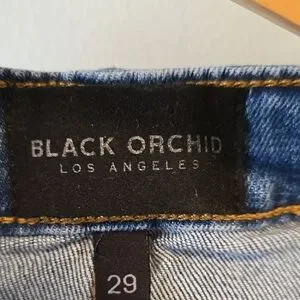 These Black Orchid jeans feature a classic blue hue with a stylish flare and wide leg design, perfect for a relaxed yet chic look. The denim offers a slightly faded appearance, adding a touch of vintage charm to your wardrobe. Ideal for casual outings, these jeans provide both comfort and style.