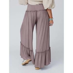 - Description: Unveil effortless style with the Summer Frills Pant by Three Bird Nest, offered in a chic Dusty Purple. Designed with a flattering high waist and a pull-on closure, these wide-leg pants feature a relaxed fit for maximum comfort. The flowy fabric and frilled details add a feminine and playful touch, ideal for both chic and casual outings. With no pockets, these solid-patterned pants maintain a streamlined silhouette.