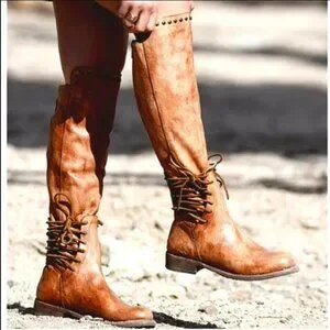 New without box with minor flaw - loose thread on back of boot by zipper. Does not affect functionality. Size 9 US womens. Beautiful honey tan color. Please note, boots are intentionally distressed and have uneven dying for an antiqued finish. 21" tall, calf circumference 15".