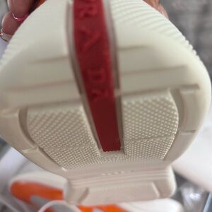 Stylish athletic sneakers in vibrant orange and white. Perfect for sports and casual wear.