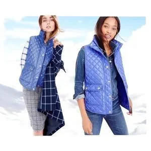 Stay warm in style in this J. Crew Quilted vest. It is made of down-filled polyester. It has a standing collar. There is a hidden zip with a snap closure. Two front pockets have snap closures. The vest is 100% Polyester. Machine wash cold.