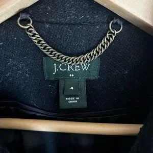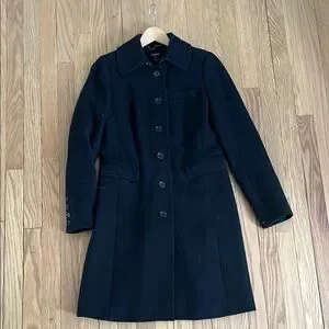 Elevate your outerwear collection with this J. Crew black lady day wool blend coat, designed with a tailored fit and knee-length silhouette. Its classic top coat style offers a sophisticated look, making it an ideal choice for both formal and casual settings.