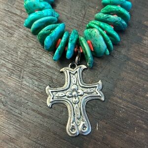 Elegant turquoise necklace featuring a silver cross pendant. Perfect for adding a touch of color and style to any outfit.