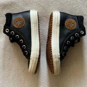 Ready for any adventure, the Converse Chuck Taylor All Star PC Boot Hi in black is perfect for unisex kids who love style and comfort. The high-top design offers excellent ankle support, while the durable leather upper and rubber outsole ensure these boots can handle any playground or casual outing. The classic logo adds a timeless touch, making these boots a versatile choice for school, weekend activities, or family outings. Pre-owned but still in great condition, these boots are ready for their next journey. Size: 13