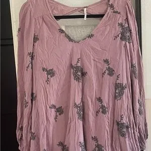 Elegant mauve dress with floral patterns, perfect for any occasion. Features a stylish open back and long sleeves.