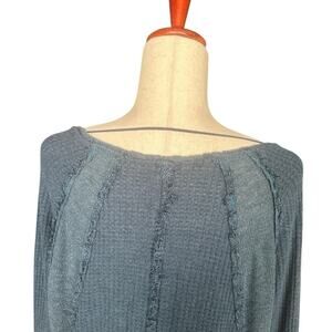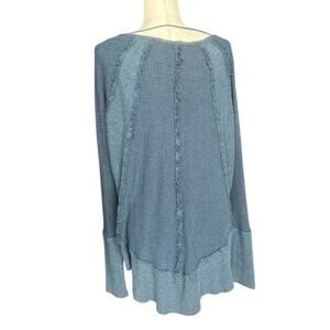 We The Free top, oversized blue top, long sleeve shirt, distressed top, scoop neckline, size L top, casual wear, boho style, well-loved top, cozy blue top, Free People style, layering top, vintage-inspired, relaxed fit, pre-loved